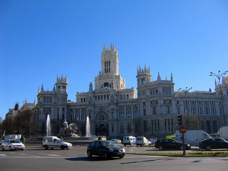 マドリードの中心《プエルタ・デル・ソル》を、マンサナーレス川とは正反対にアルカラ通りを東に向かうと、シベレス広場に着きます。ロータリーになった道路の真ん中は噴水になっていて、ギリシャ神話のキュベレがライオンのひく馬車に乗った像が中央にあります。この噴水はスペインサッカーチーム、レアル・マドリードのシンボル的存在であり、レアル・マドリードがリーグ優勝や他のコンペティションで優勝を果たすと、この噴水で優勝を祝う習慣となっています。また、この広場の周辺にはスペイン銀行、マドリード市庁舎本部、軍司令部などの重要な施設が隣接しています。